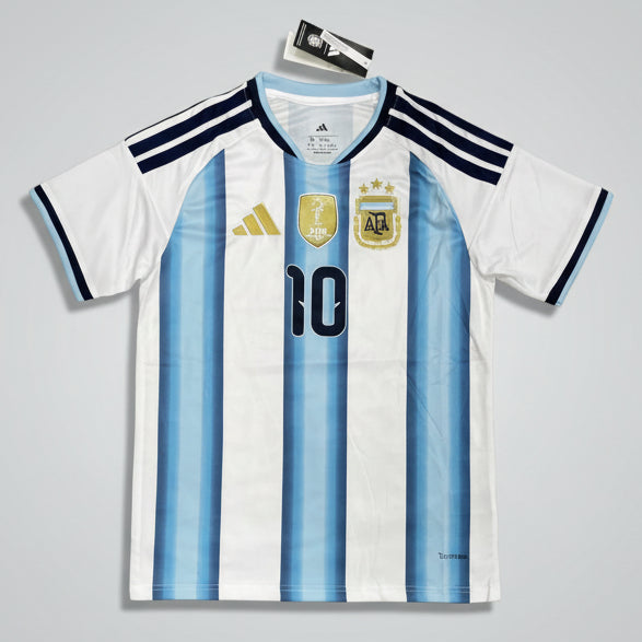 Honor football royalty with the Argentina Messi 10 Home Jersey World Cup 2026. Inspired by Argentina’s iconic sky blue and white stripes, this jersey represents passion, legacy, and World Cup glory. Featuring Messi 10 on the back, it celebrates the timeless impact of one of the greatest players the game has ever seen.