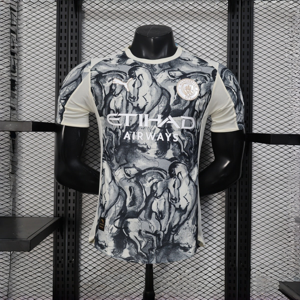 Showcase your passion for Manchester City with the exclusive Year of the Horse Special Edition Player Version Jersey. Featuring an artistic horse inspired pattern across the front, this jersey represents strength, energy, and championship spirit. Built with high performance, breathable fabric, it delivers a slim player fit with superior stretch and moisture control for intense match conditions. The premium construction, modern silhouette, and eye catching design make it ideal for match days, training, or collectors seeking a standout City jersey.